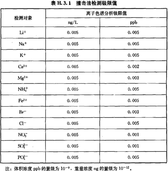 H.3.1 撞擊采樣法適用于檢測空氣中的陰陽(yáng)離子(Li+、Na+、K+、Ca2+、Mg2+、Fe2+、Br-、Cl等)的濃度。檢測限值可按表H.3.1執行。