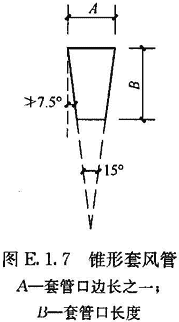 E.1.7 選用套管法時(shí),可用輕質(zhì)板材或膜材做成與風(fēng)口內截面相同或相近、長(cháng)度大于2倍風(fēng)口邊長(cháng)的直管段作為輔助風(fēng)管,連接于過(guò)濾器風(fēng)口外部,在套管出口平面上,均勻劃分小方格,方格邊長(cháng)不大于200mm,在方格中心設測點(diǎn)。對于小風(fēng)口,最少測點(diǎn)數不少于6點(diǎn)。也可采用錐形套管,上口與風(fēng)口內截面相同或相近,下口面積不小于上口面積的一半,長(cháng)度宜大于1.5倍風(fēng)口邊長(cháng),側壁與垂直面的傾斜角不宜大于7.5°,以測定截面平均風(fēng)速,乘以測定截面凈面積算出風(fēng)量(圖E.1.7)。