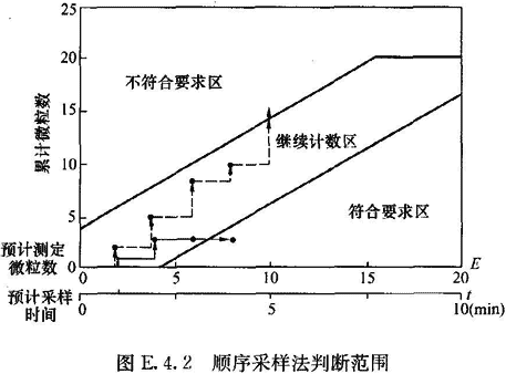 13 對于需要很大采樣量、耗時(shí)很大的某粒徑微粒的檢測,可采用順序采樣法,即將每次測定結果標注于圖E.4.2上,當標注點(diǎn)落入不合格區時(shí),即停止檢測,結果為不達標;當標注點(diǎn)落入合格區時(shí),停止檢測,結果為達標;當標注點(diǎn)一直在繼續區中延伸,而總采樣量已達到表E.4.2—2的最小采樣量,累計微粒數仍小于20,即停止檢測,結果為達標;當標注點(diǎn)一直在繼續區中延伸,而總采樣量未達到最小采樣量,但累計微粒數已超過(guò)20,即停止檢測,結果為不達標。
