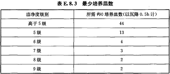 7 培養皿數應不少于微粒計數濃度的測點(diǎn)數,如工藝無(wú)特殊要求應大于等于表E.8.3中的最少培養皿數,另外各加1個(gè)對照皿。