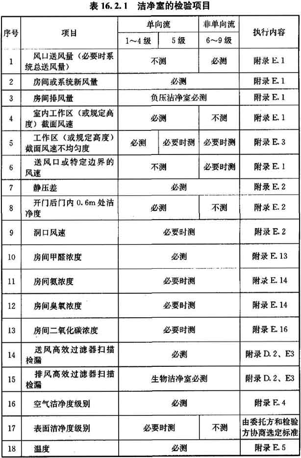 16.2.1 潔凈室在高效過(guò)濾器現場(chǎng)檢漏后的必測項目,應符合表16.2.1的要求,也可由該表選擇選測項目。