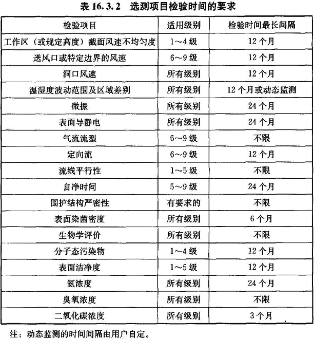 16.3.2 在工程驗收后為確認潔凈室的選測項目符合要求的日常檢驗(不含臨時(shí)抽測)周期可按表16.3.2確定。