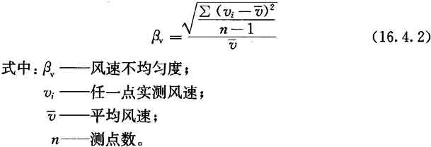 16.4.2 當需對室內單向流品質(zhì)作細致確認時(shí),可測工作區(或規定高度)截面風(fēng)速不均勻度。風(fēng)速不均勻度應按附錄E檢驗,并按下式計算,結果不應大于0.25。