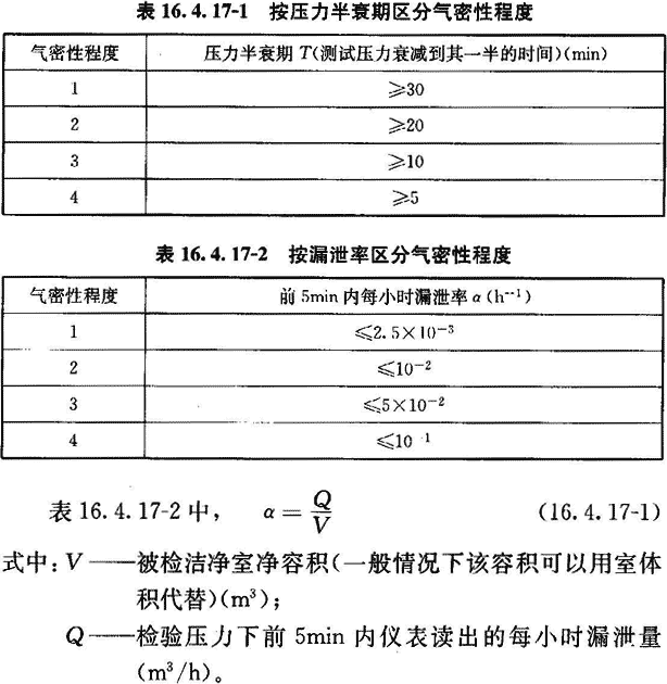 16.4.17 當對潔凈室的嚴密性有特殊要求時(shí),可測其圍護結構嚴密性。圍護結構嚴密性按附錄G檢驗。檢驗結果應符合設計要求。當設計無(wú)明確要求時(shí),可在以下兩表的任何一種評定方法中任選一種方法,兩表中最大測試壓力設定為500Pa。
