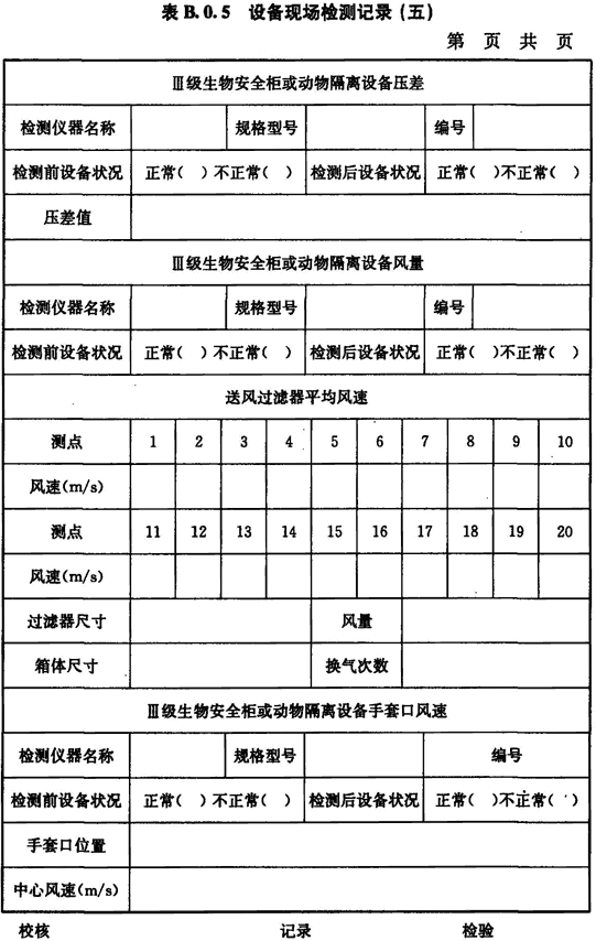 B.0.5 Ⅲ級生物安全柜或動(dòng)物隔離設備的壓差、風(fēng)量、手套口風(fēng)速的檢測應按表B.0.5進(jìn)行記錄。