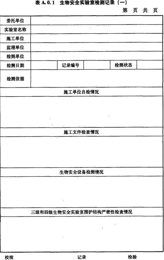 A.0.1 生物安全實(shí)驗室施工方自檢情況、施工文件檢查情況、生物安全柜檢測情況、圍護結構嚴密性檢測情況應按表A.0.1進(jìn)行記錄。