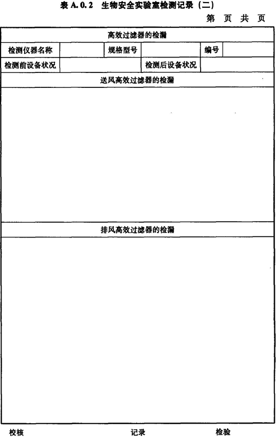 A.0.2 生物安全實(shí)驗室送風(fēng)、排風(fēng)高效過(guò)濾器檢漏情況應按表A.0.2進(jìn)行記錄。