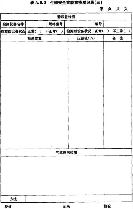 A.0.3 生物安全實(shí)驗室房間靜壓差和氣流流向的檢測應按表A.0.3進(jìn)行記錄。