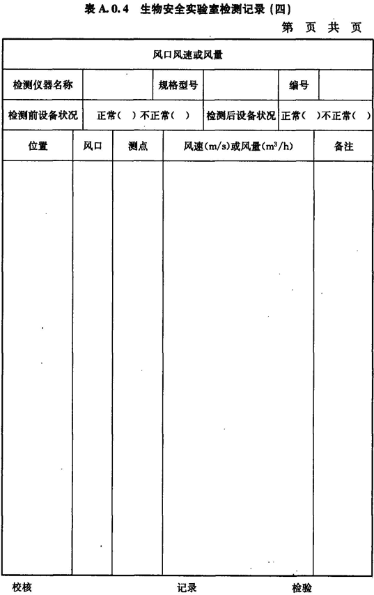 A.0.4 生物安全實(shí)驗室風(fēng)口風(fēng)速或風(fēng)量的檢測應按表A.0.4進(jìn)行記錄。
