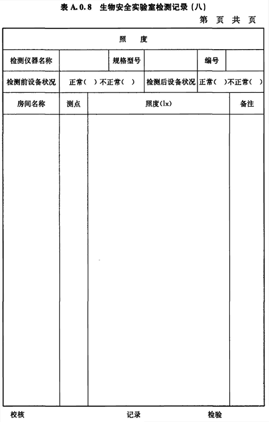 A.0.8 生物安全實(shí)驗室房間照度的檢測應按表A.0.8進(jìn)行記錄。