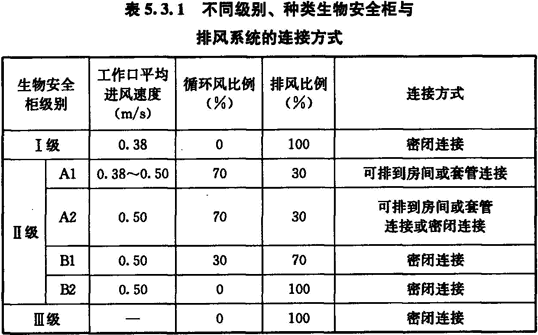 4 不同級別、種類(lèi)生物安全柜與排風(fēng)系統的連接方式應按表5.3.1選用。
