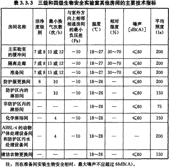 3.3.3 三級和四級生物安全實(shí)驗室其他房間的主要技術(shù)指標應符合表3.3.3的規定。