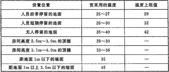 5.7.2 低溫加熱電纜輻射供暖宜采用地板式,低溫電熱膜輻射供暖宜采用頂棚式。輻射體表面平均溫度應符合本規范第5.4.1條的相關(guān)規定。