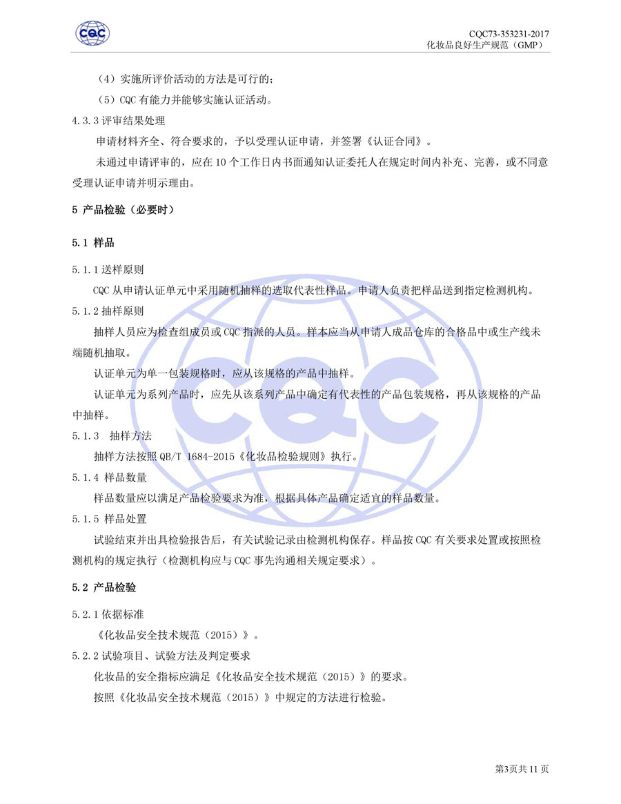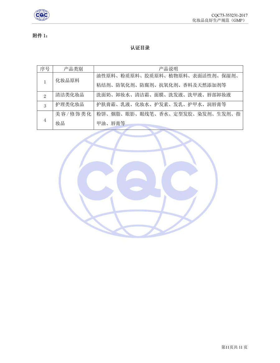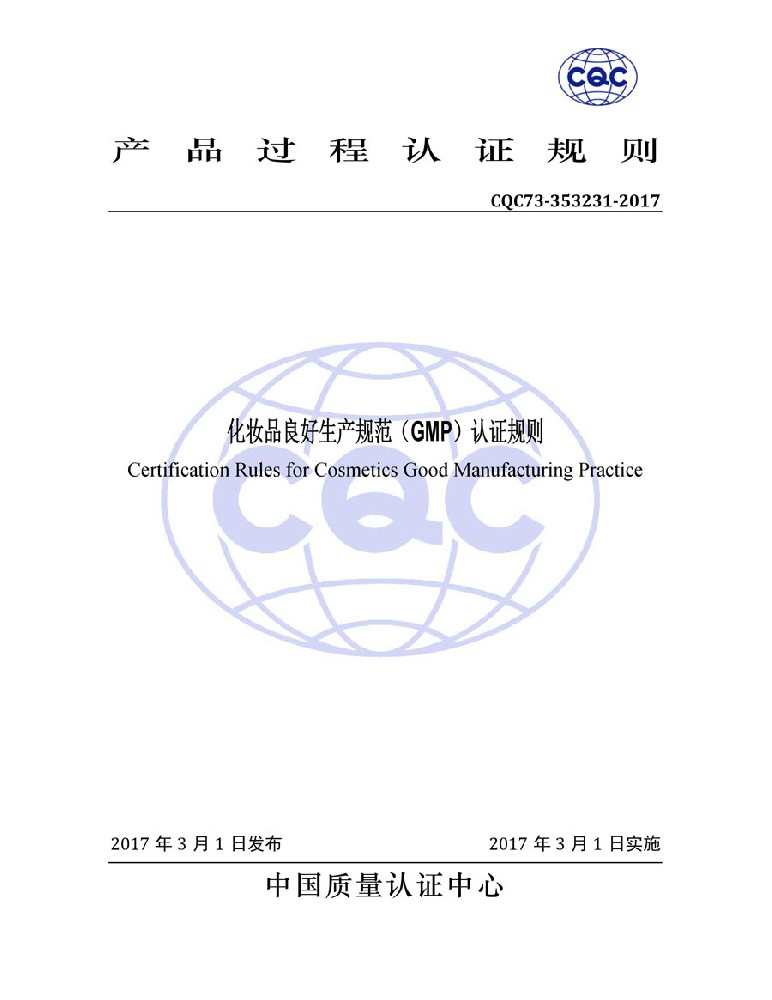 認證依據為美國農業(yè)部《Cosmetic Good Manufacturing Practice Guideline》, European Federation for Cosmetic Ingredients (EFfIC)-GMP for cosmetic ingredient,ISO 22716-2007《化妝品良好生產(chǎn)規范》、CQC73-353231-2016《化妝品認證實(shí)施規則》及適用的法律法規等。